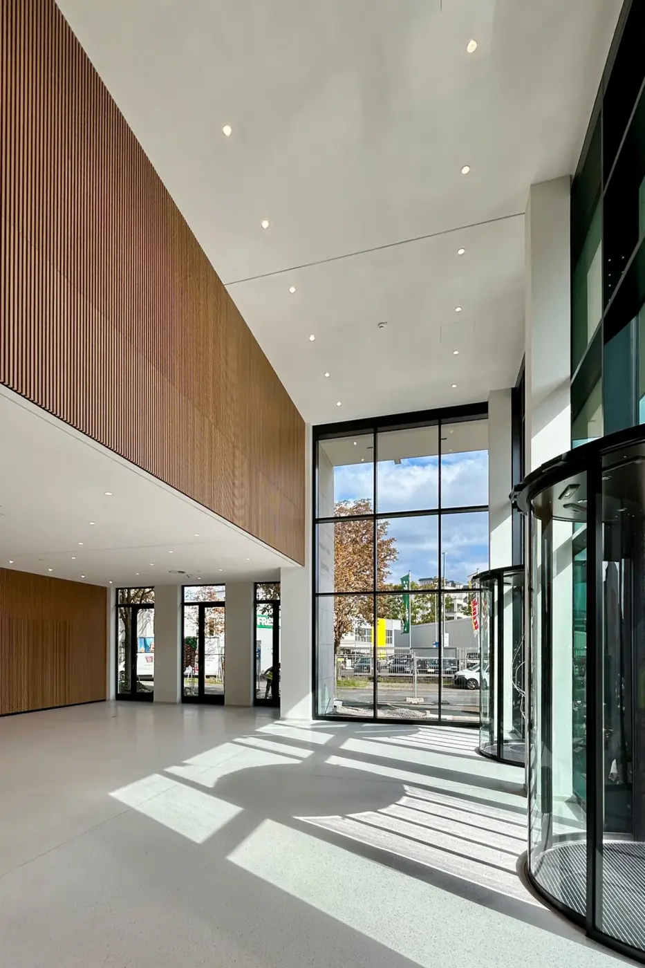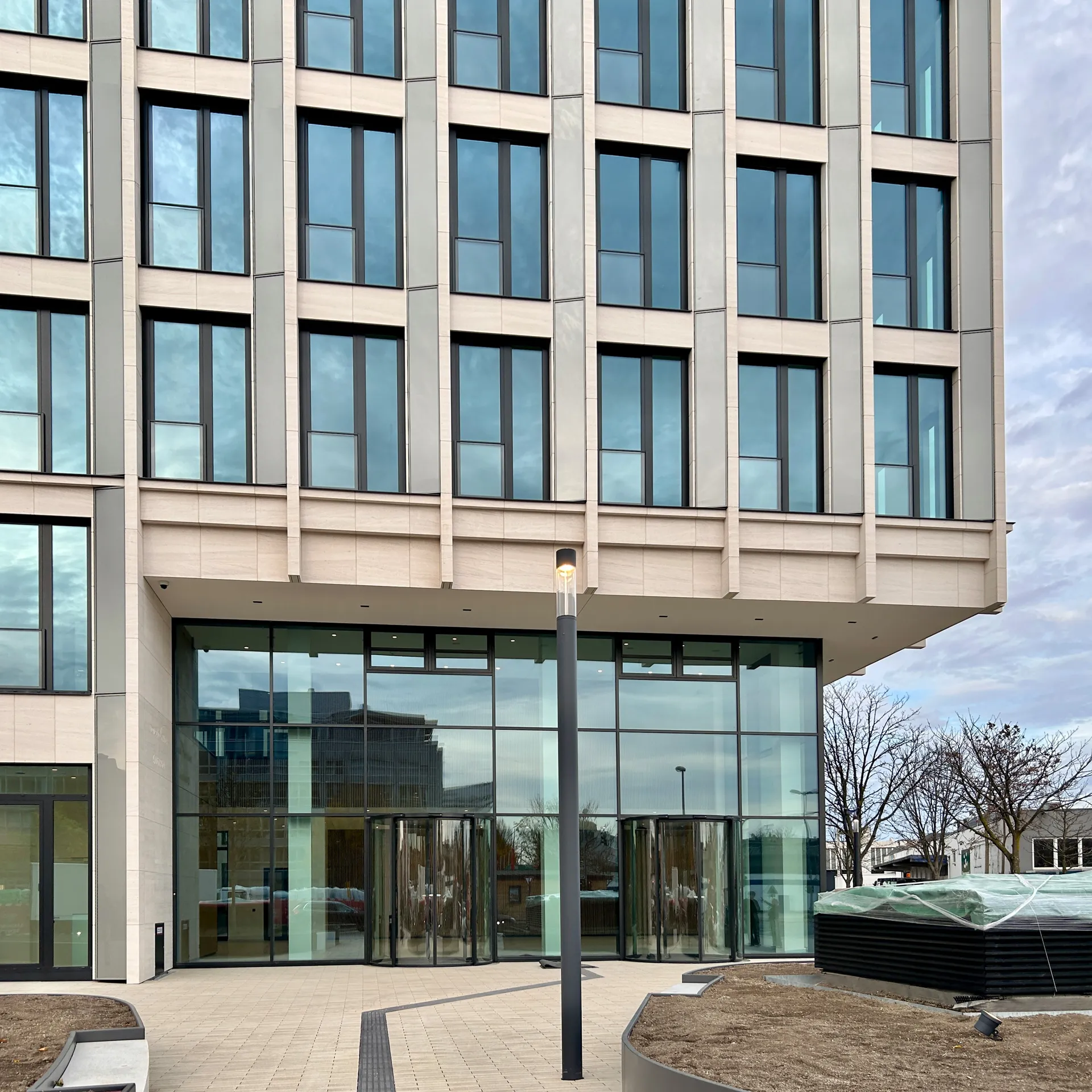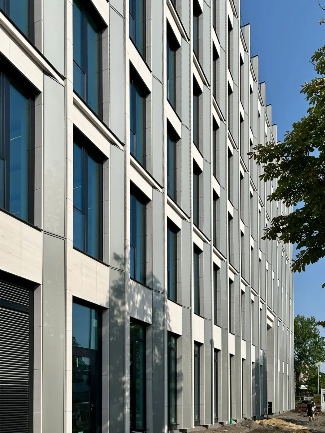 Ein großzügiger Vorplatz mit einem hohen Anteil an Grünflächen verbindet den öffentlichen Straßenraum elegant mit dem Gebäude und schafft einen einladenden Zugang. Die Nebeneingänge befinden sich auf der Ost- und Nordseite der Gebäude.