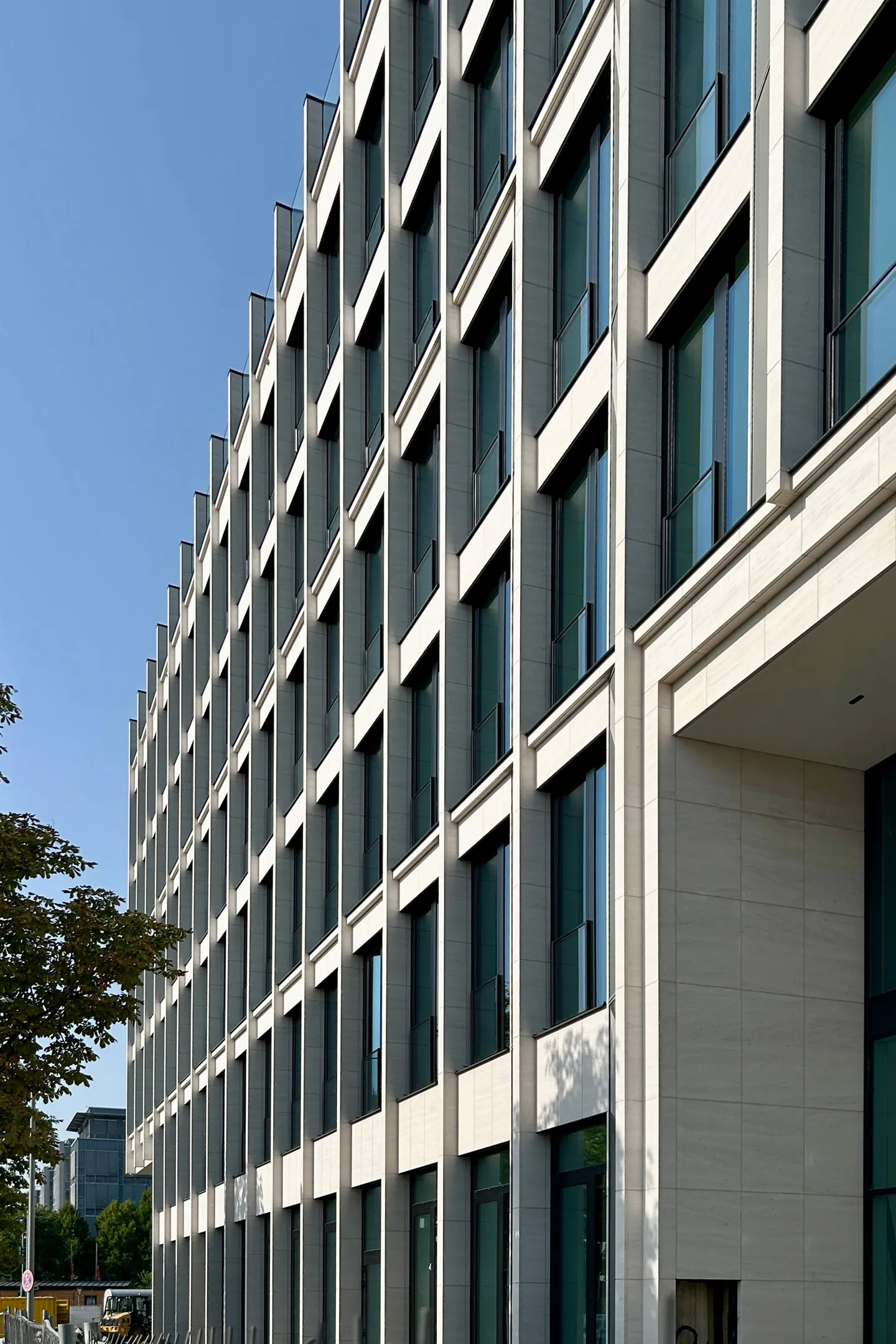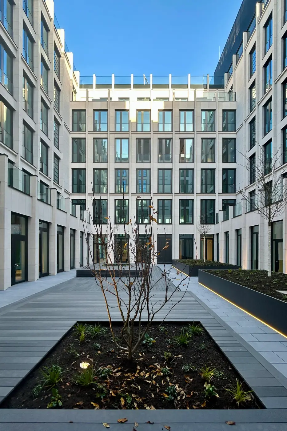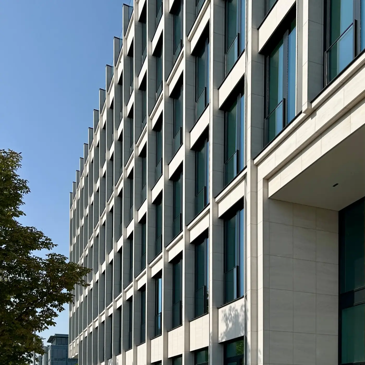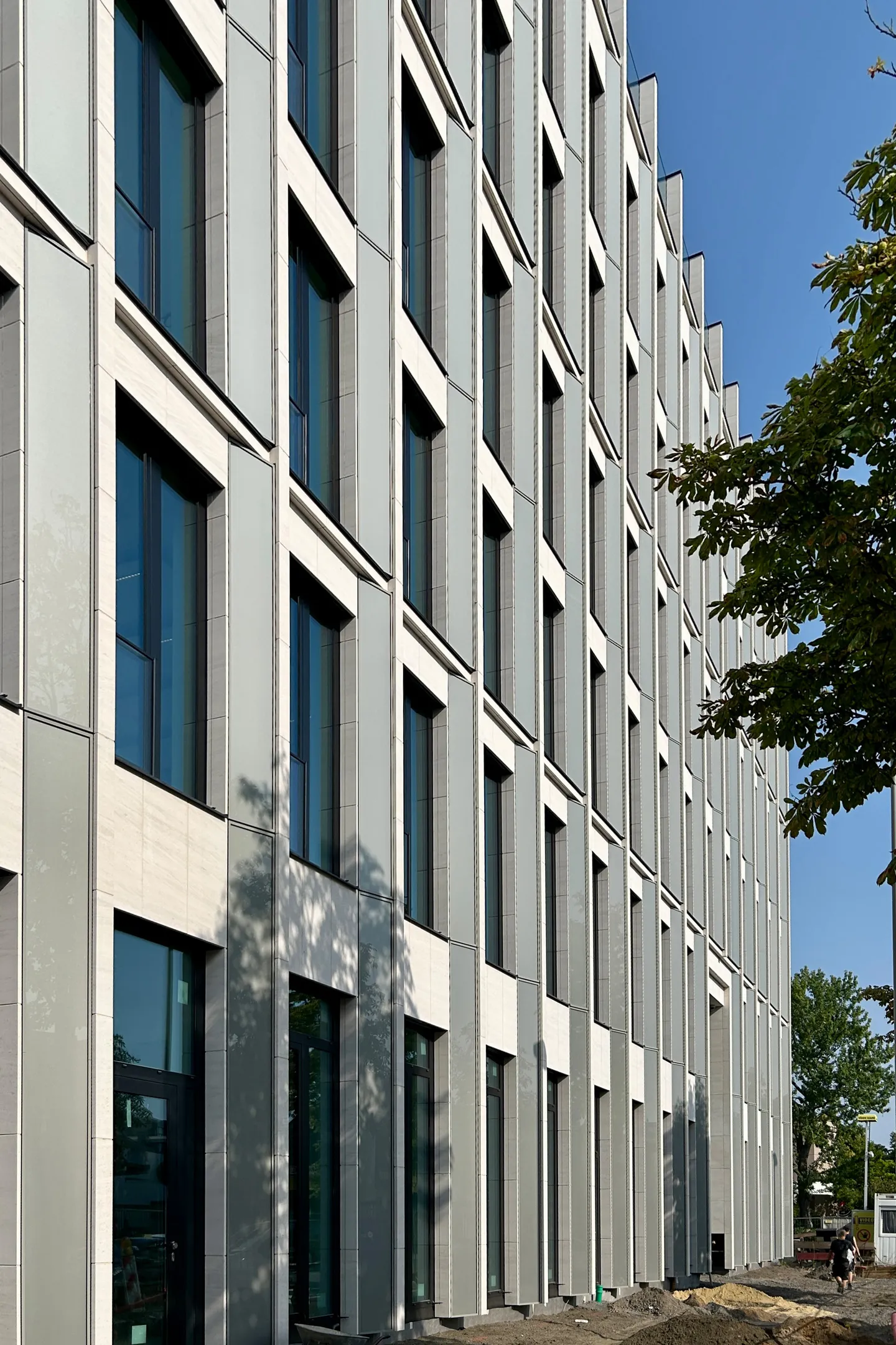 Ein großzügiger Vorplatz mit einem hohen Anteil an Grünflächen verbindet den öffentlichen Straßenraum elegant mit dem Gebäude und schafft einen einladenden Zugang. Die Nebeneingänge befinden sich auf der Ost- und Nordseite der Gebäude.