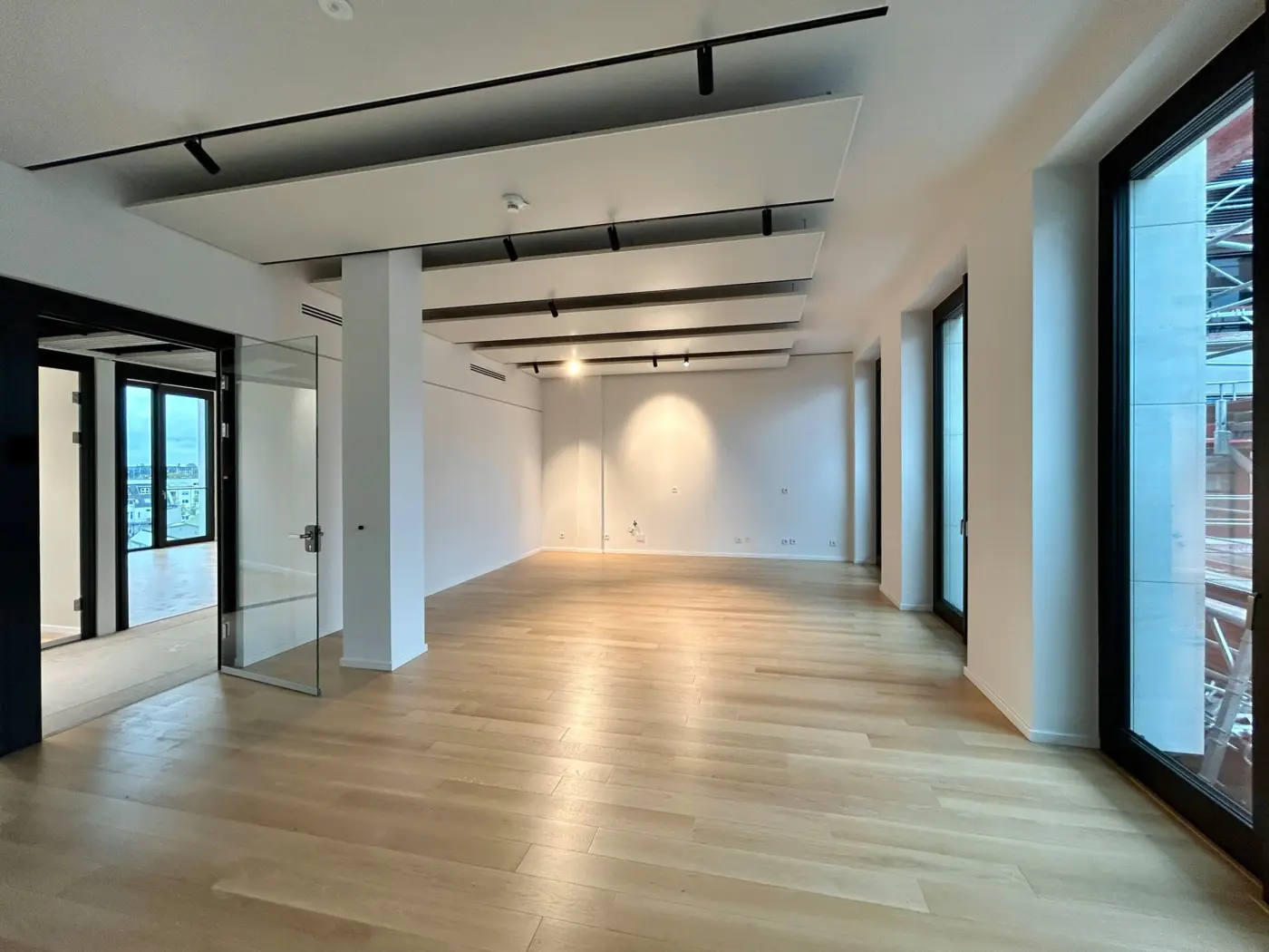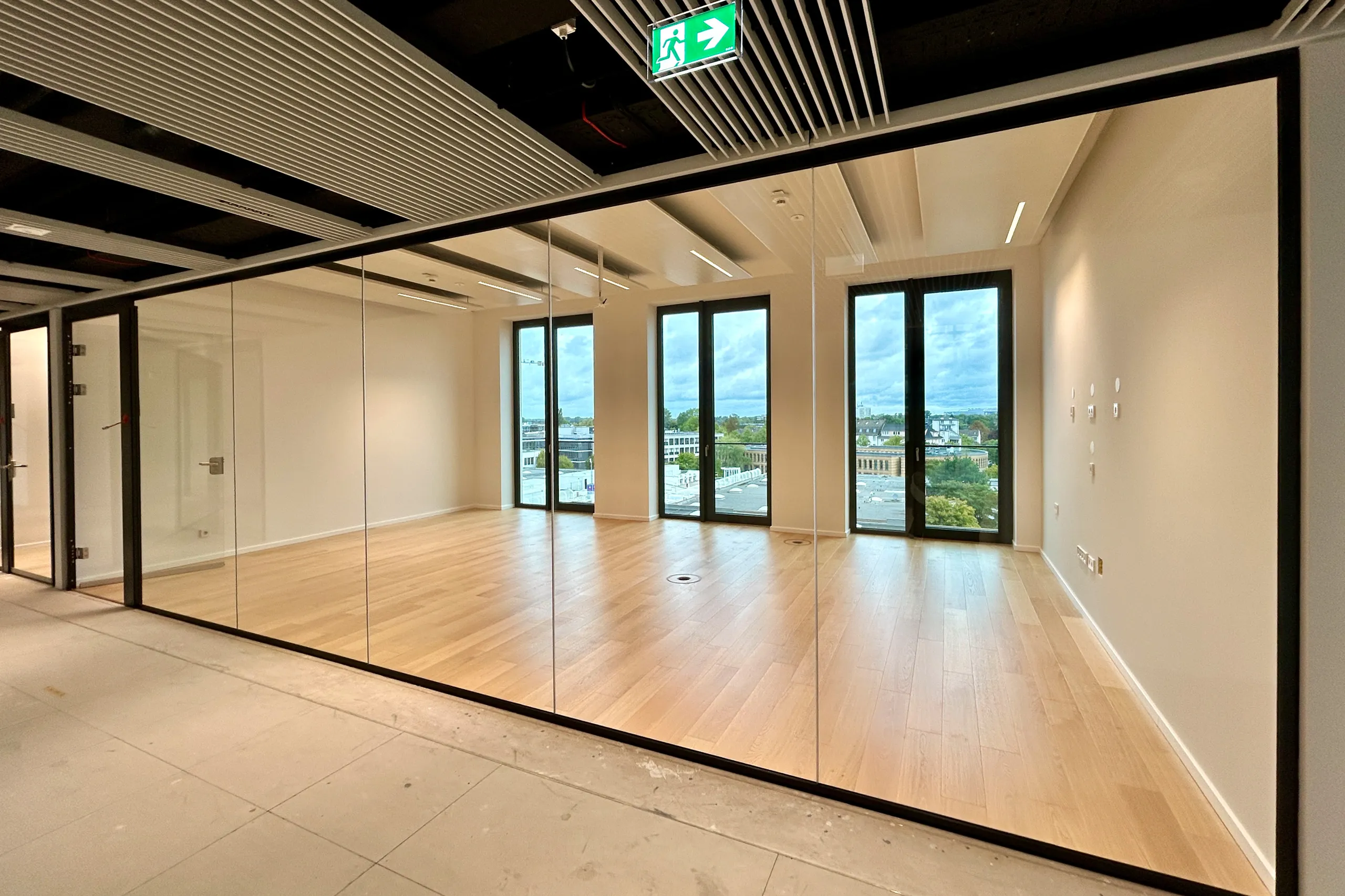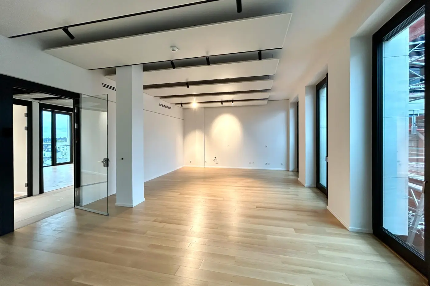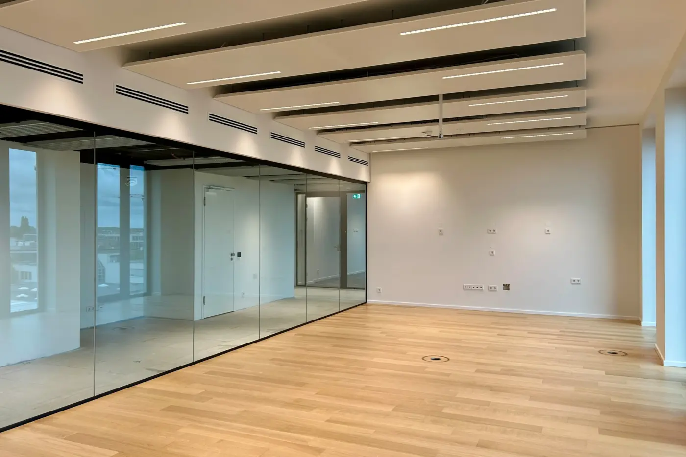 Wände können in Trockenbauweise oder als Glas-Systemtrennwände realisiert werden, um den Raum optimal an die Bedürfnisse des Mieters anzupassen.