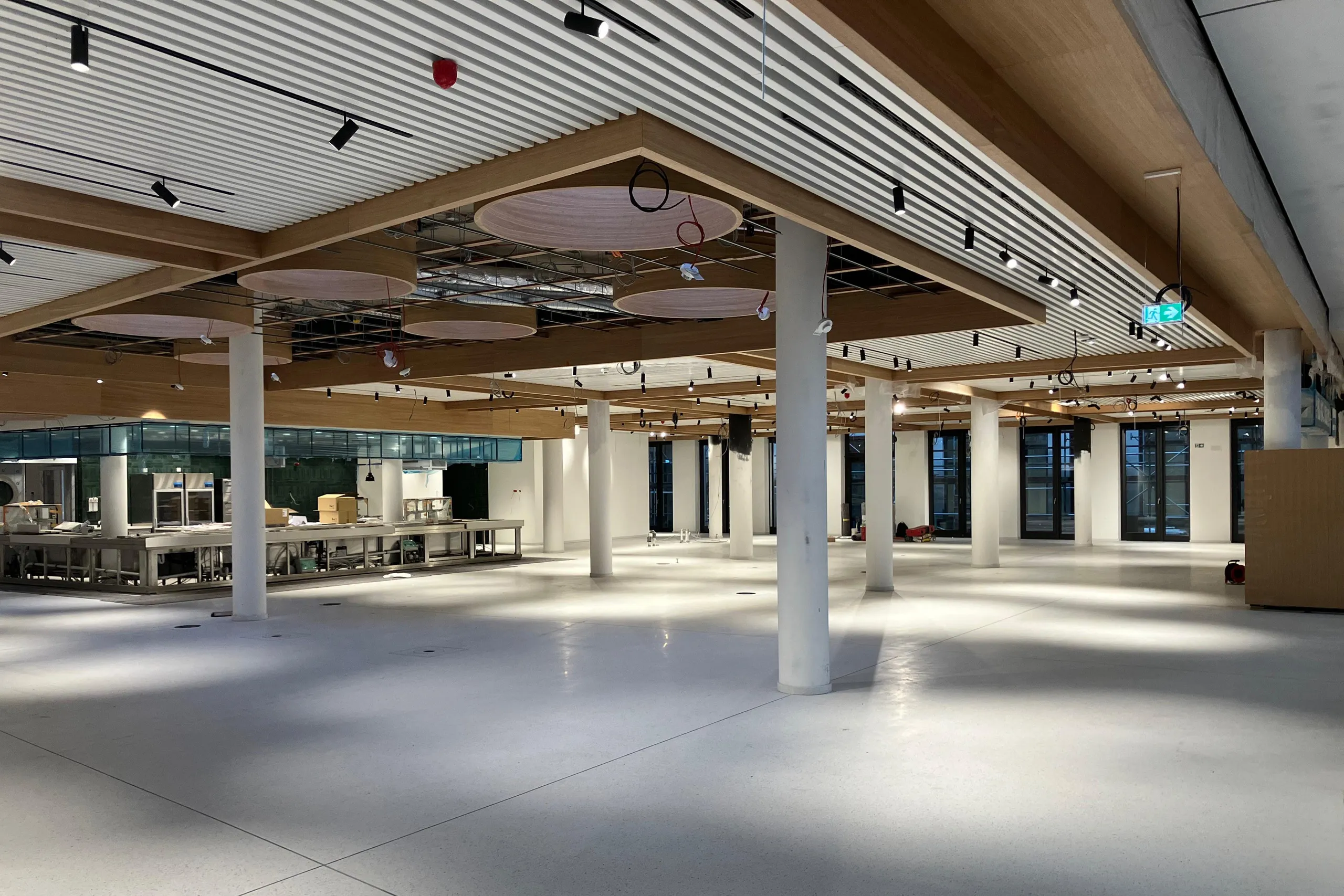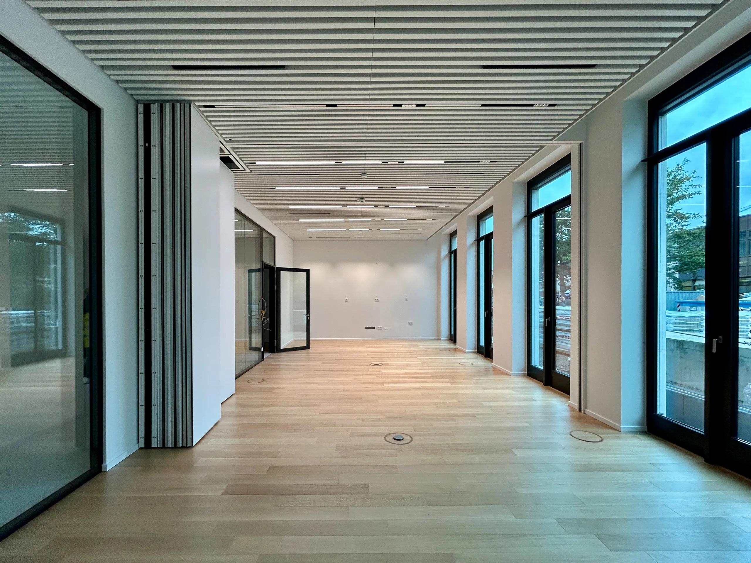 Optimale EDV- und Elektroversorgung der Arbeitsplätze durch einen durchgehenden Hohlraumboden, der flexible Anpassungen ermöglicht.