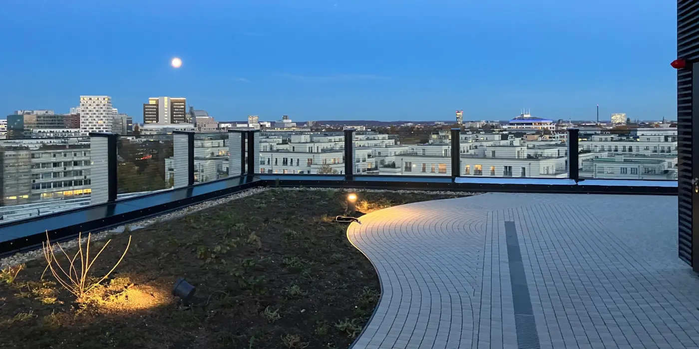 Die große Dachterrasse bietet eine tolle Aussicht auf die Umgebung. Stilvolle Möblierung und großflächige Begrünung laden zum Verweilen und Genießen ein, auch zu Besprechungen oder Veranstaltungen. Mit Regenspeichern und Begrünung trägt die Terrasse zu der besonders nachhaltigen Bauweise bei.
